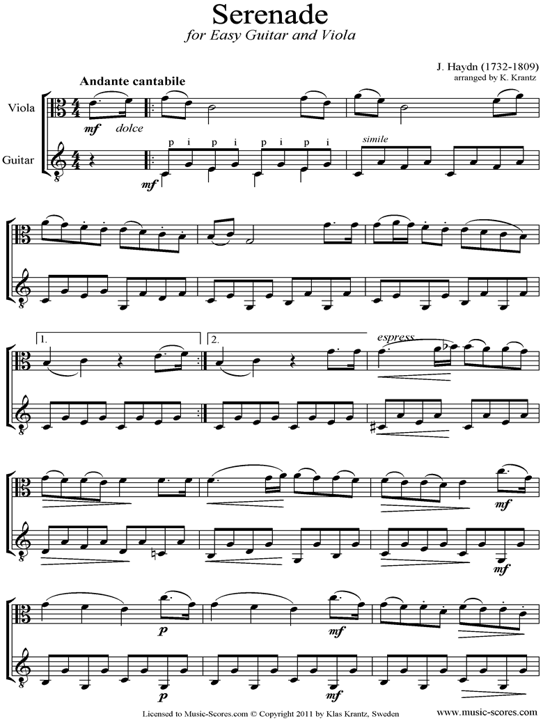 Op.3, No.5 Quartet No.17 in F major 2nd mvt Viola, Guitar