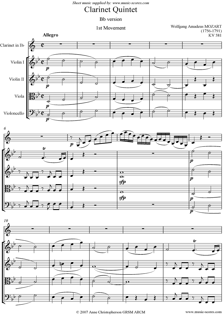 K581 Clarinet Quintet 1st mt Bb Clarinet, strings